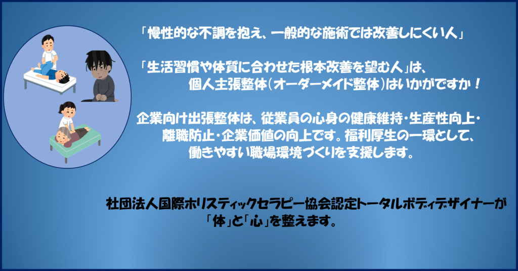 災害時の レジリエンス、社員教育などの職場文化の形成支援 - 体:オーダーメイト整体、自律神経の整えなど、免疫力や回復力を向上