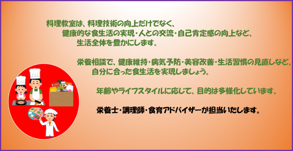 - 食:料理教室、食育を通して、作ることの楽しさ、食材への関心と知識を高める